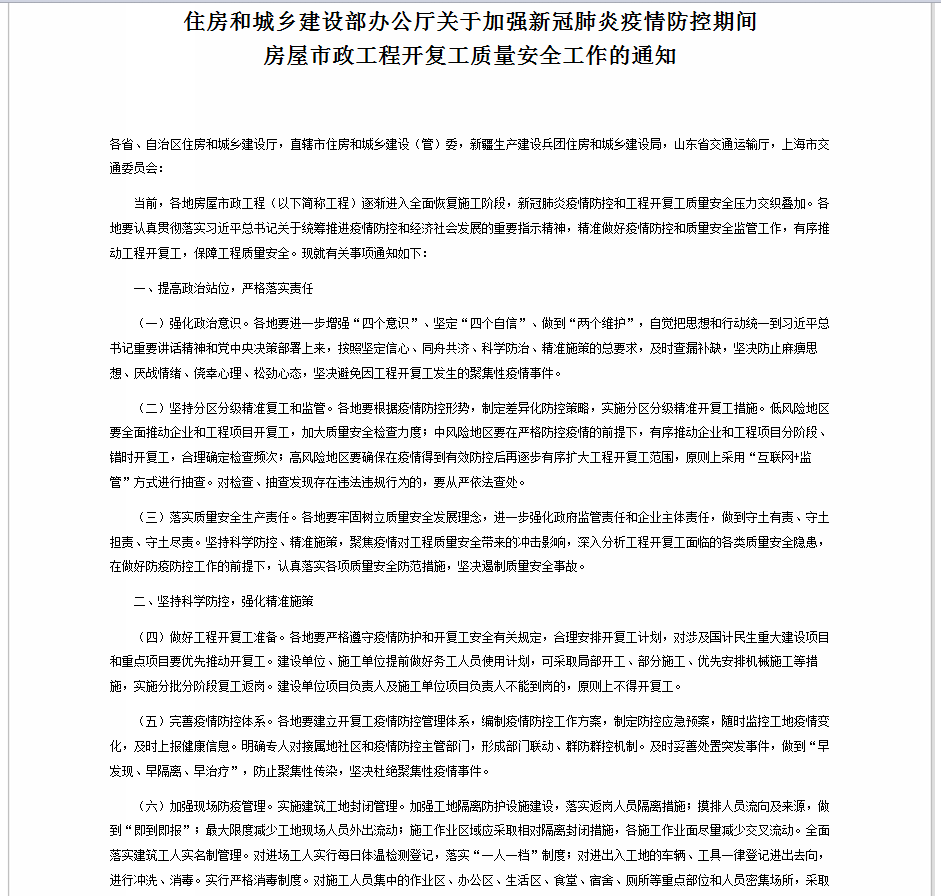 关于加强新冠肺炎疫情防控期间房屋市政工程开复工质量安全工作的通知